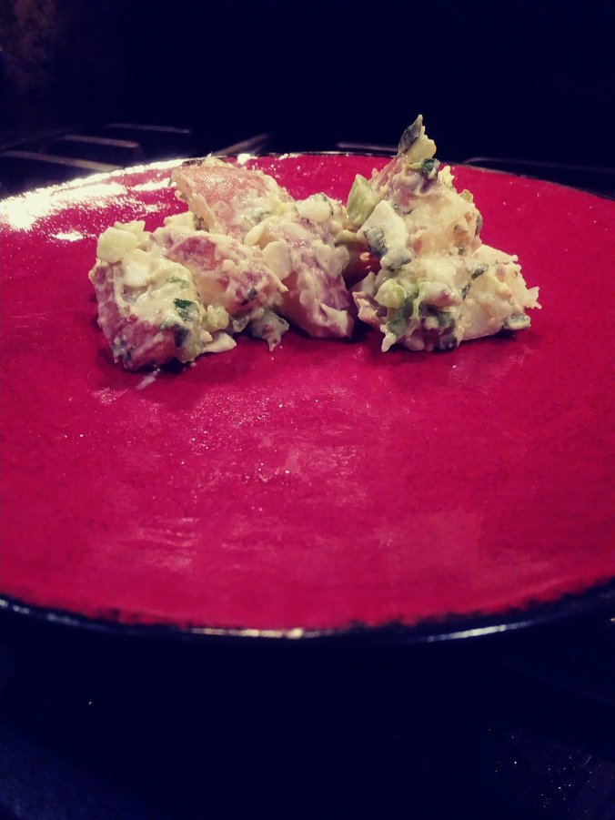 Boil the potatoes and garlic in heavily salted water. Drain when cooked al dente. Once cooled, carefully toss in the celery, green onion, and egg. Drizzle mixer with avocado oil. Pour the dressing over potato mixer and lightly mix so the potatoes do not fall apart. Chill in the refrigerator for at least 30 minutes.